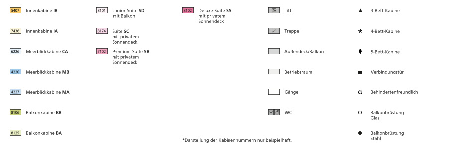 Alle Kabinen und Suiten sind mit einer Klima-Anlage, Teppichboden, Dusche/WC, Sat.-TV, interaktives TV, Informations- und Entertainmentsystem, Radio, Föhn, zusätzliche Kopfkissen und Direktwahltelefon ausgestattet. In allen Suiten befinden sich Duschen und/oder Badewannen. Die Handtücher in den Kabinen und Suiten werden täglich ausgetauscht und am Pool liegen gegen Pfand Pooltücher für die Gäste bereit. Im Wellnessbereich finden die Gäste Bademäntel vor. Die Meerblickkabinen verfügen teilweise über Bullaugen und bei einigen Meerblickkabinen kann die Sicht durch Rettungsboote oder Stahlwand behindert, bzw. verdeckt sein. Einige Kabinen sind mit Pullmann-Betten (Wand- und Deckenbetten, Reisebetten) ausgestattet. Die Junior-Suiten auf Deck 7, 8 und Deck 9 sind mit einem Doppelbett und mit 2 Sofabetten ausgestattet. Der Balkon ist mit Sitzmöbeln für den bequemen Aufenthalt versehen.